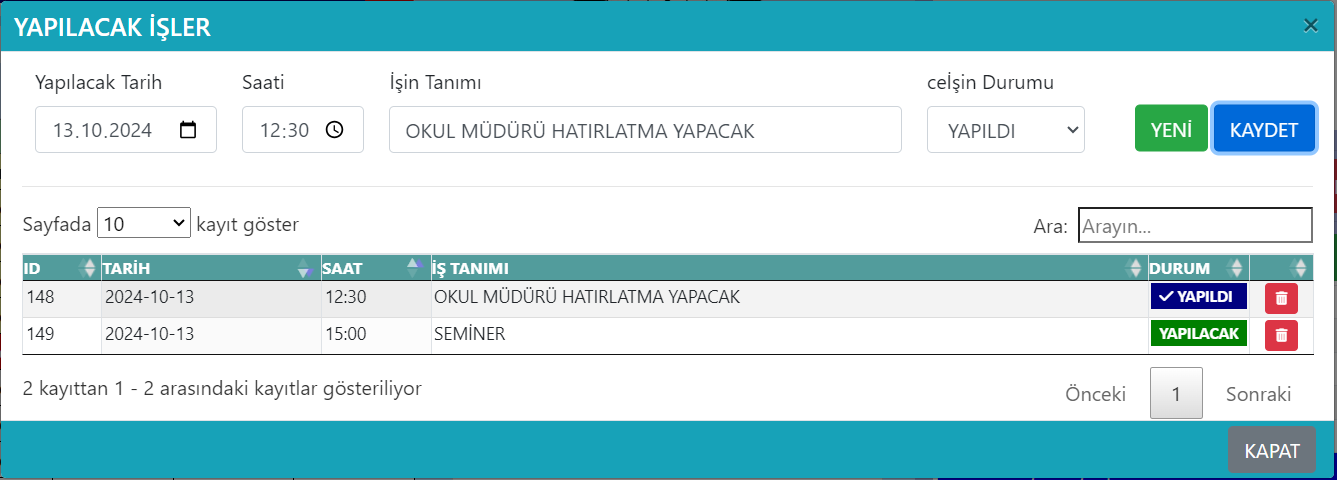 Bir de sağ alt köşede "Ajanda-Planlama-Yapılacak İşler" butonu var onu tıkladığımız zaman ise yapılacak işler sayfasında ayarladığımız tarih ve saatte iş tanımını da belirleyip kaydettiğimizde yapılacak işler listesine eklemiş oluyoruz. Aynı zamanda eğer bu iş bugün yapılacaksa sayfamızın sağ alt köşesinde bildirim şeklinde görünmektedir. Herhangi bir iş yapıldığı zaman bunu "Yapılacak" yerine "Yapıldı" diye onayladığımız zaman ana sayfadaki bildirimlerden kalkmış oluyor.
